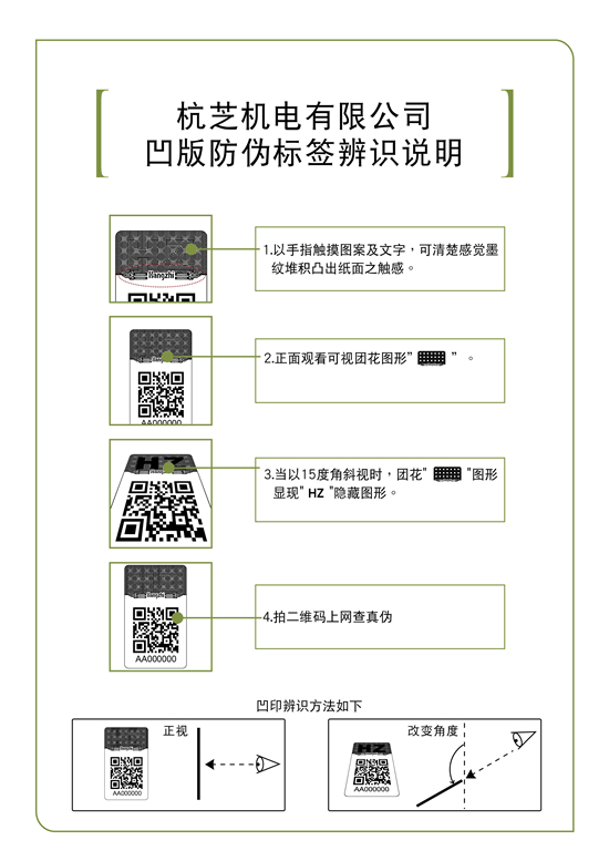 客戶購買杭芝生產(chǎn)系列產(chǎn)品時可通過觀察產(chǎn)品上凹版防偽標(biāo)簽?zāi)芊癖鎰e來判斷是否為正品。